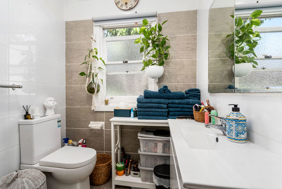 Modern bathroom centrally placed between the bedrooms