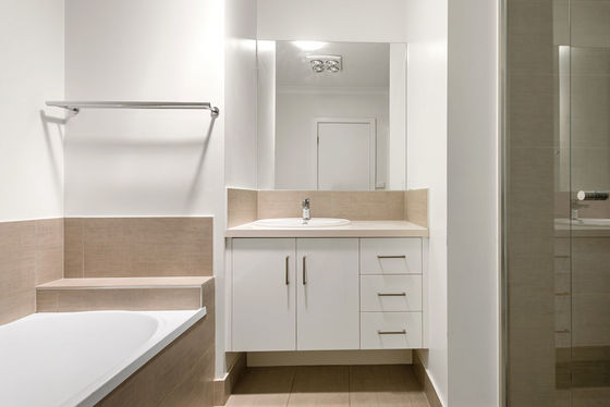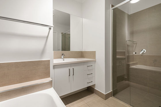 The central bathroom is designed for everyday ease, offering an oversized shower, a separate bath and a clean, modern aesthetic.