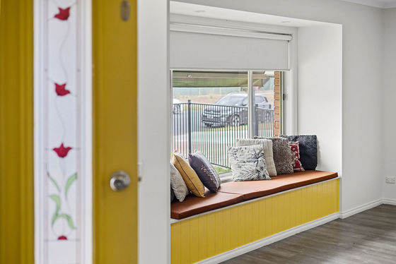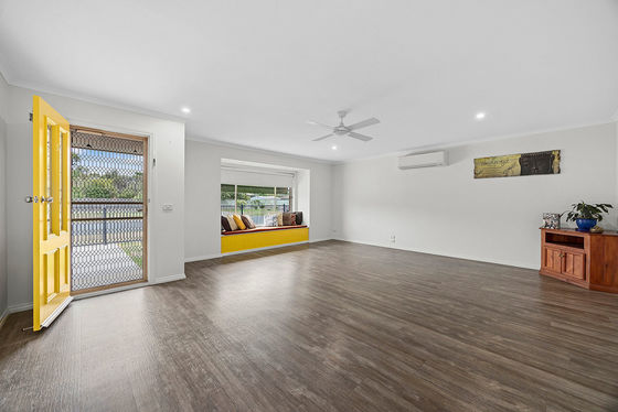 - Main living zone with timber floorboards, window seat, ceiling fan and split-system heating and cooling.