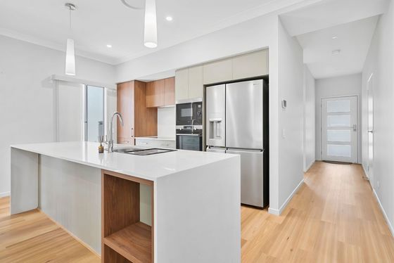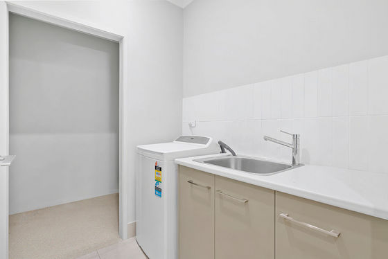 The stunning contemporary kitchen finished in matte almond cabinetry with gleaming white stone bench tops and just a hint of timber provides an elegance and practicality that is second to none. Featuring an enormous stone topped waterfall breakfast bar, state of the art appliances and loads of storage, this kitchen is certainly a chef's delight. An adjoining laundry delivers both convenience and good design without compromising aesthetics.