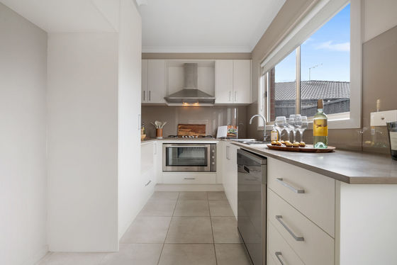The elegant kitchen is the heart of the home, boasting sleek stone benchtops, stainless steel appliances, and ample storage, all overlooking a meal and living area ideal for everyday living and entertaining.