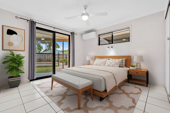 The master bedroom features air-conditioning, ceiling fan, walk-in robe, access to outdoor entertaining area, and a large ensuite with shower, toilet, and a vanity with ample bench space.