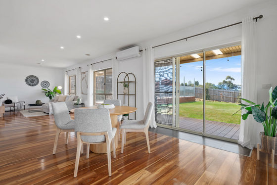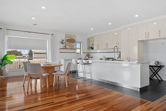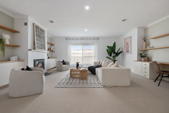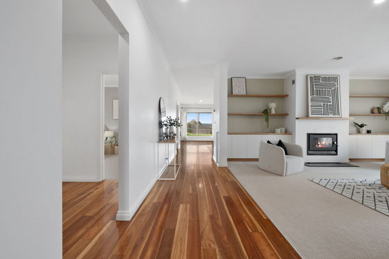 The home welcomes you into a warm and inviting interior where generous proportions are immediately evident. A large central living zone is anchored by a charming wood fireplace, creating a cosy atmosphere for cooler months, while ducted heating and split system cooling ensure year-round comfort. Flowing through to the kitchen and meals area, this space is ideal for both everyday living and entertaining. The kitchen is finished with 40mm stone benchtops, quality appliances and excellent storage, making it both functional and visually appealing