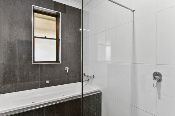 Main bathroom with floor to ceiling tiles, semi frameless shower and spa bath