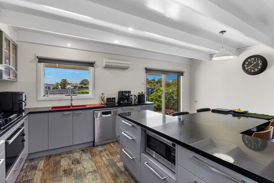 At the heart of the entire home and part of the original property home is the well-appointed and updated kitchen with classy grey granite benchtops, island bench and a built-in dining table, while still allowing for room for an additional casual dining space. Sliding glass doors open to the immaculate and low-maintenance side yard. Across the hall opens up into a spacious lounge with an original mantel and chimney. A perfect room to unwind by the fireplace and enjoy your favourite book or use as a rumpus room for the kids.