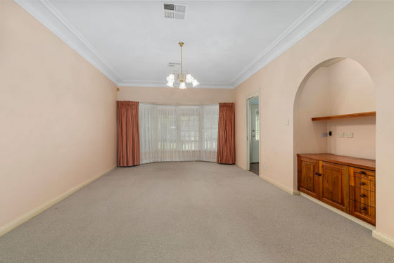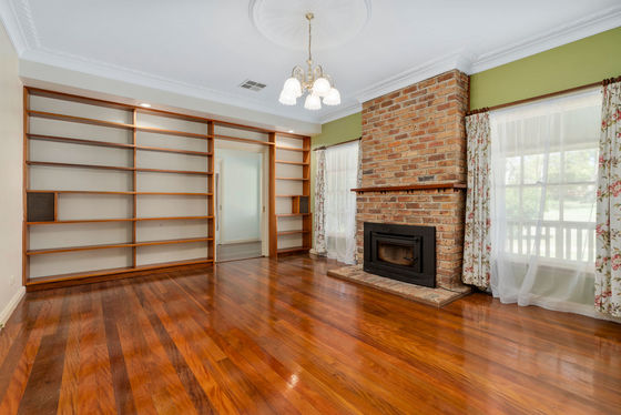 * 2 open plan living areas, one with a fireplace and built-in shelving. The second features a gorgeous bay window and a built-in arched storage cabinet