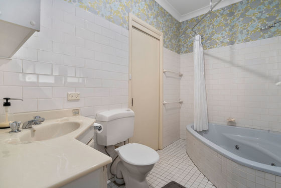 * Bathroom featuring a combined spa bath/shower, toilet and vanity with ample storage