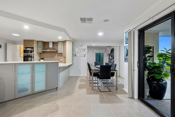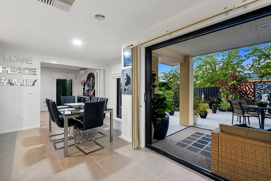 The main bedroom, with a walk-in robe and ensuite, opens off the entry foyer and sits opposite the bright and welcoming lounge room. Bifold doors from the lounge roll back to reveal an open-plan hub featuring a spacious north-facing dining area, a family living space and a well-equipped kitchen.