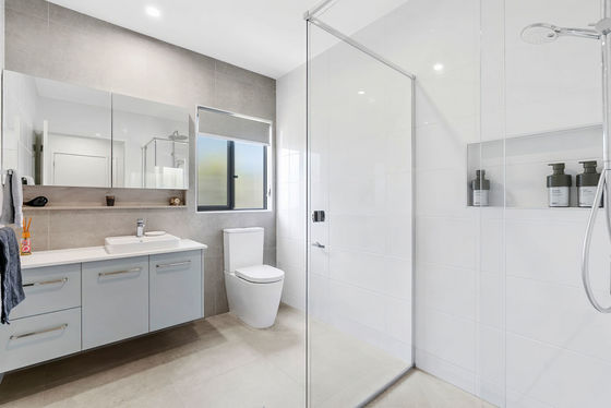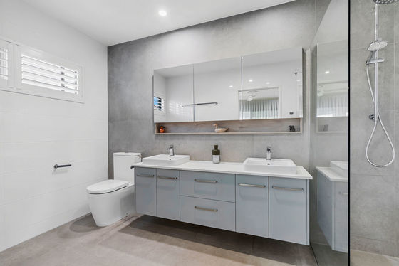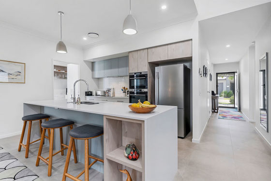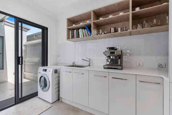 At the heart of the home, the stunning contemporary kitchen combines style with functionality. Featuring bespoke cabinetry, gleaming white stone benchtops and an oversized waterfall island, it is equipped with premium appliances and abundant storage. A cleverly designed butler's pantry doubles as a discreet laundry, with an adjoining drying court; delivering exceptional practicality while maintaining a sleek, sophisticated aesthetic.