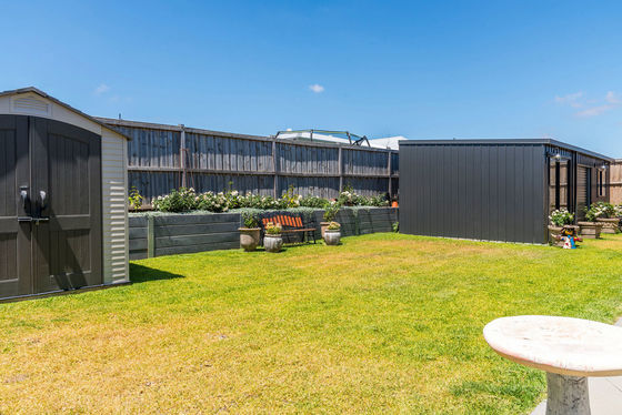 Beyond the interiors, outdoor living is equally impressive. Two covered alfresco spaces extend the home's entertainment capacity, including one accessed via large sliding doors that invite the outdoors in-perfect for BBQs and social gatherings. A 4 x 7.5 metre powered and plumbed shed, an additional utility shed, offers exceptional versatility for trades, projects, or additional storage needs.