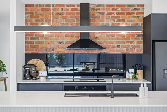 - Statement brick feature wall and custom timber TV cabinetry