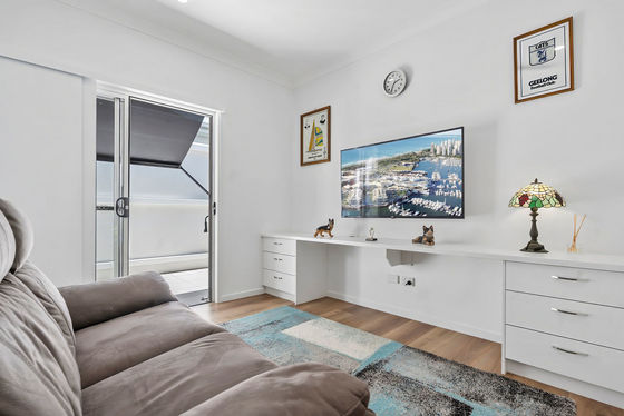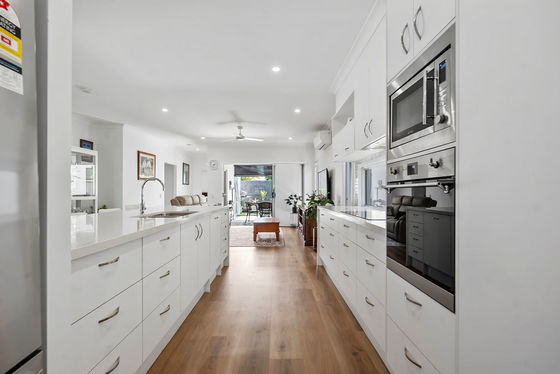 At the heart of the home, the stylish galley kitchen impresses with stone benchtops, soft winter white cabinetry, premium appliances and a generous island bench. Cleverly positioned, it creates a natural separation between living and dining zones while remaining ideal for everyday living and entertaining.