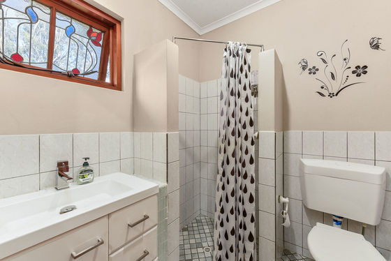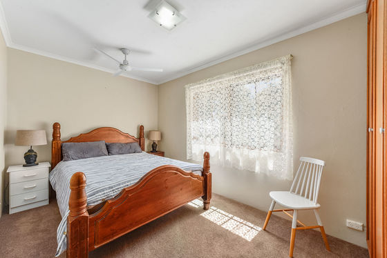 The home comprises three generously sized bedrooms, all carpeted for comfort. The main bedroom is privately positioned away from bedrooms two and three and features a walk-in robe and ensuite with vanity, shower, and toilet. Bedrooms two and three include built-in robes and are serviced by a well-appointed main bathroom with inset bath, shower, timber vanity, and toilet.
