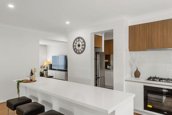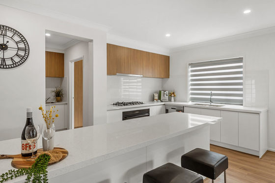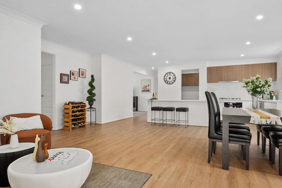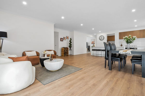 At the rear of the home, the light-filled open-plan kitchen, living, and dining area forms the true heart of the property. Designed for both everyday living and entertaining, the kitchen showcases sleek stone benchtops, soft-close cabinetry with finger-pull joinery, ample storage, quality 900mm Franke appliances, and the added benefit of a generous pantry, keeping preparation and storage neatly tucked away while maintaining a clean and functional kitchen space.